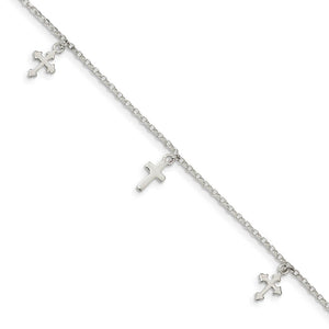 Anklets are a great way to add fun, flash and a feminine touch. This polished design made from sterling silver features a 1.5mm solid link rolo chain and dangling 7 x 11mm cross charms. It is adjustable in length from 9 to 10 inches and closes with a spring ring clasp.