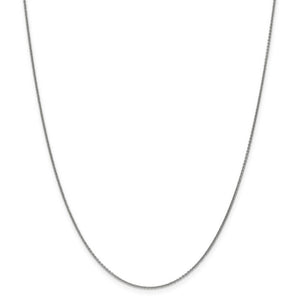 A simple, alternating pattern of tiny oval links join together to create a classic cable chain made of gleaming rhodium-plated 10k white gold. The delicate supple design of this 1mm width, 24-inch long chain closes with a lobster claw clasp.