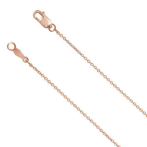 Solid oval links of 14k rose gold interlock with alternating links turned 90-degrees to create a classic cable chain design that never goes out of style. This polished necklace measures 1mm in width by 18-inches in length and fastens with a lobster claw clasp.
