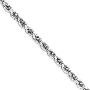 This gorgeous rope chain handmade from solid rhodium-plated 14k white gold features a sparkling, diamond-cut design that measures 4.5mm in width and is finished with a lobster claw clasp. Looks great alone, layered with multiple chains or paired with a charm or pendant to complete your desired look. 22 inches in length.