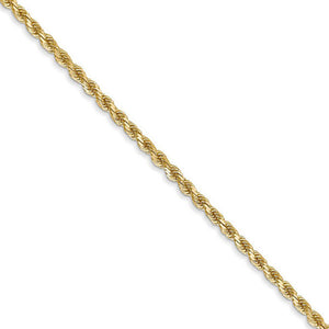Spiraling rope chains made of 14k yellow gold enhanced with diamond-cuts are extremely popular because they offer a classic design with maximum shine. Flexible and strong, this 22-inch necklace chain is 2mm in width and fastens with a lobster claw clasp.