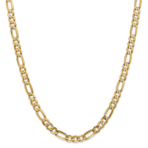 Solid concaved oval links made of polished 10k yellow gold interlock in a reoccurring three and one pattern that closes with a lobster claw clasp. The easy elegance of a Figaro chain looks great with dress or casual wear. This men's necklace is approximately 6mm in width by 24-inches in length.