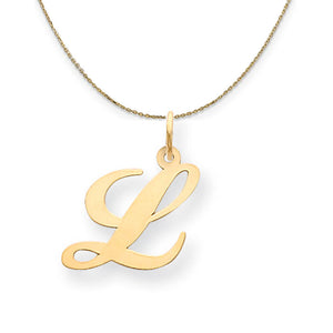 Indulge in a traditional initial charm that subtly enhances and personalizes your jewelry. Each fancy script letter is approximately 16mm (5/8 inch) in width by 20mm (3/4 inch) in length, fashioned from 14k yellow gold with a high polished finish and includes a standard jump ring. The pendant is Includes a 24 inch, 0.8mm 14k yellow gold cable chain with a lobster clasp.