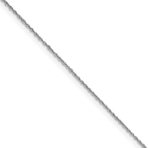 Twisting links of 14k white gold form a distinctive feminine chain that will add an unexpected shimmer to your favorite charm or pendant thanks to its diamond-cut styling. This delicate Singapore chain is 0.8mm in width by 18 inches in length and closes with a classic spring-ring clasp. Made in Italy.