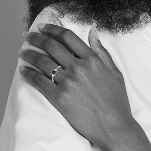 With the sparkle of day and the elegance of night, this blue diamond small concave square ring is perfect for any occasion. Designed from sterling silver and features a rhodium plated finish to reduce tarnishing. It is approximately 6mm (1/4 inch) in width across the top and 2mm in width at the bottom. The irradiated blue diamonds are I2-I3 in clarity and the combined weight is 1/20 carat. Available in wholes sizes 6-8 only.