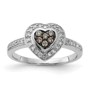 Like the shade of the sun setting into the hues of the evening, this two tone diamond heart ring capture that beauty. Fashioned from tarnish resistant rhodium plated sterling silver and prong set with natural I2-I3 clarity, H-I white and champagne diamonds totaling 1/4 carat. It features a 10mm (3/8 inch) halo heart design, a fancy undercarriage, and has a 2mm width band. Available in wholes sizes 6-8 only.
