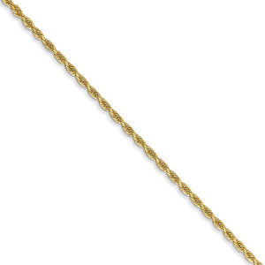 • Spiraling rope chains made of 14k yellow gold enhanced with diamond-cuts are extremely popular because they offer a classic design with maximum shine. Flexible and strong, this 18 inch necklace chain is 1.5mm in width and fastens with a lobster claw clasp.