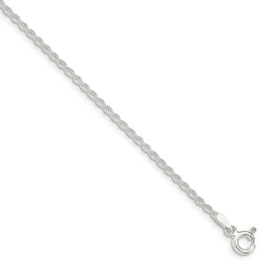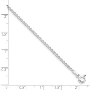 A classic rope chain anklet features twisted links woven together in a spiral design that offers strength, integrity and elegance all in one. This one is made of polished sterling silver, closes with a spring ring clasp and is 1.75mm in width by 9-inches in length.