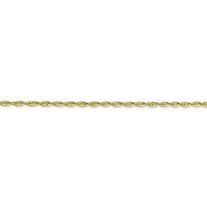 Spiraling rope chains made of 10k yellow gold enhanced with diamond-cuts are extremely popular because they offer a classic design with maximum shine. Flexible and strong, this extra lightweight, solid link chain measures 1.8mm in width, 9 inches in length and fastens with a sturdy lobster-claw clasp.