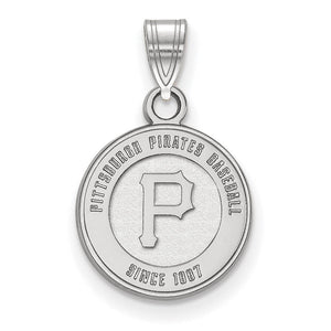 It is time to celebrate your favorite Major League Baseball (MLB) team, the Pittsburgh Pirates! We are a certified retailer, and this authentic women's small laser-etched pendant is officially licensed. It is created from rhodium plated 10k white gold and approximately 12mm in width (7/16 inch or smaller than a dime). Chain not included. Made in the U.S.A. This item is not currently in-stock. Once you place your order, please allow us 5 to 7 business days to make it for you.