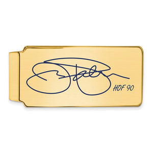 It is time to celebrate your favorite Hall of Fame baseball player, Jim Palmer! We are a certified retailer and this authentic signature money clip is officially licensed. It features a fold over design with a brushed finish that is created from 14k yellow gold plated sterling silver with navy blue epoxy. Epoxy colors may vary slightly. The color on your screen may also not reflect actual color due to variations in monitors and browsers. The approximate size is 24mm (15/16 inch) in width by 53mm (2 inches) in length. Made in the U.S.A. This item is not currently in-stock. Once you place your order, please allow us 5 to 7 business days to make it for you.