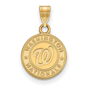 It is time to celebrate your favorite Major League Baseball (MLB) team, the Washington Nationals! We are a certified retailer, and this authentic women's small laser-etched pendant is officially licensed. It is created from 14k yellow gold plated sterling silver and approximately 12mm in width (7/16 inch or smaller than a dime). Chain not included. Made in the U.S.A.