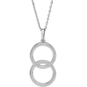 A simplistic yet elegant necklace design with a traditional or trendy style will give you a tailored look that goes from daytime wear to a night out on the town with ease. This interlocking circles necklace created from rhodium plated 14k white gold features a milgrain detailed vertical design. The approximate pendant size is 12mm (7/16 inch) in width by 21mm (13/16 inch) in length. The diamond-cut cable chain closes with a spring ring clasp, is 1mm in width and adjusts 16 to 18 inches in length. This is a made to order item and is estimated to ship 11/24/2025