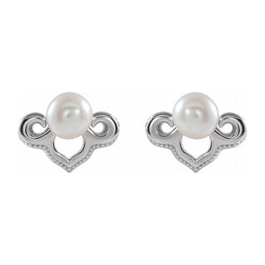 Nothing compares to the beauty and classic sophistication of pearls, the gem of the water and always appropriate. These 10 x 7mm (3/8 x 1/4 inch) friction-back post earrings created in rhodium-plated 14k white gold feature near round, white freshwater cultured pearls that are 4 to 4.5mm in size. Gemstone treatment: bleached. This is a made to order item and is estimated to ship 11/24/2025