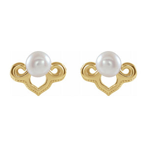 • Nothing compares to the beauty and classic sophistication of pearls, the gem of the water and always appropriate. These 10 x 7mm (3/8 x 1/4 inch) friction-back post earrings created in 14k yellow gold feature near round, white freshwater cultured pearls that are 4 to 4.5mm in size. Gemstone treatment: bleached. This is a made to order item and is estimated to ship 11/24/2025