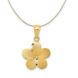 Refresh your style with a tropical flower blossom created from 14k yellow gold featuring a satin and diamond-cut finish. This gorgeous pendant is approximately 14mm (9/16 inch) in width by 22mm (7/8 Inch) in length, which includes the tapered bail. Includes a 16 inch long, 0.9mm wide, solid 14k yellow gold cable chain with a spring ring clasp.