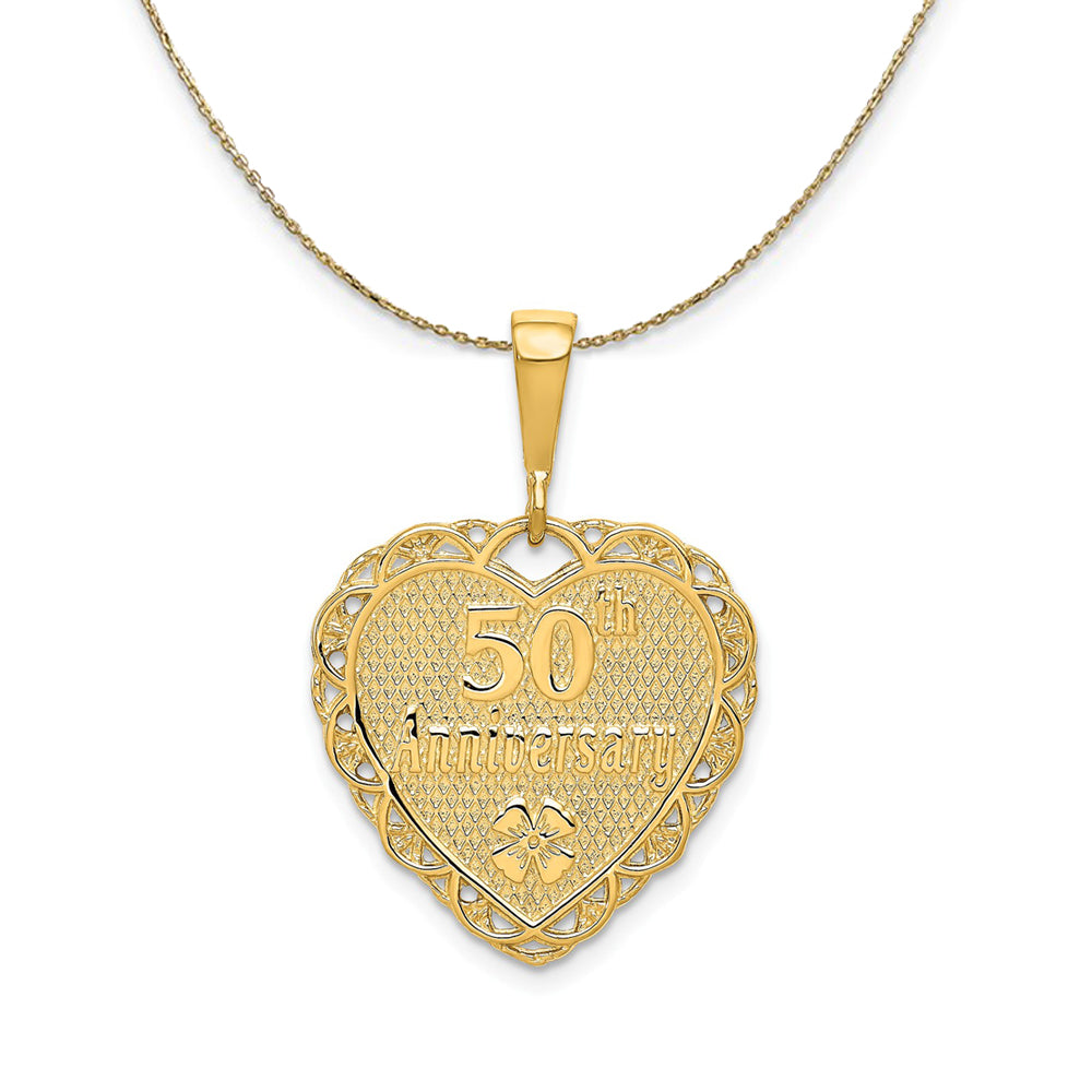This happy 50th anniversary scalloped heart pendant is crafted with 14 karat yellow gold and it features a polished and textured finish with a scalloped edge and a reversible design. The approximate size is 20 mm x 29 mm and its average item weight is 2.8 grams. Includes a 16 inch long, 0.9mm wide, solid 14k yellow gold cable chain with a spring ring clasp.