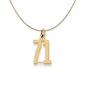 Celebrate your favorite sports player, lucky number or milestone date in your life with a prominent polished 14k yellow gold charm. This flat elongated number is approximately 15mm (9/16 Inch) in length and is finished with a classic jump ring that will accommodate up to a 2mm chain. Includes a 20 inch long, 0.9mm wide, solid 14k yellow gold cable chain with a spring ring clasp. All double-digit combinations from 10-99 are custom made to order so please allow approximately 7-10 additional business days for shipping.