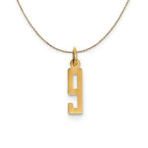 Celebrate your favorite sports player, lucky number or milestone date in your life with a prominent polished 14k yellow gold charm. This flat elongated number is approximately 4mm (3/16 inch) in width by 15mm (9/16 Inch) in length and is finished with a classic jump ring that will accommodate up to a 2mm chain. Includes a 18 inch long, 0.9mm wide, solid 14k yellow gold cable chain with a spring ring clasp.