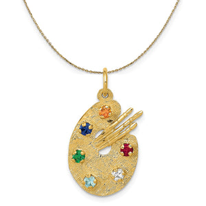 Start conversations wherever you go with a unique charm created to spark interest and reveal your individual style. This painter's palette fashioned from 14k yellow gold features a textured design prong set with multi-colored cubic zirconia stones. It is approximately 14mm (9/16 inch) in width by 20mm (3/4 Inch) in length and finished with a standard jump ring. The pendant is . Includes a 16 inch, 0.8mm 14k yellow gold cable chain with a lobster clasp.