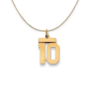 Celebrate your favorite sports player, lucky number or milestone date in your life with a prominent 14k yellow gold charm. Each polished number is approximately 13mm (1/2 Inch) in length, which is finished with a 2mm top bar and a classic jump ring. The pendant is . Includes a 20 inch, 0.8mm 14k yellow gold cable chain with a lobster clasp.