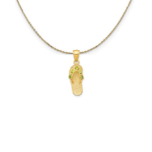 Bring summertime glam with a splash of color to every occasion with this cubic zirconia flip-flop pendant fashioned from polished 14k yellow gold. It measures approximately 7mm (1/4 Inch) wide by 25mm (1 Inch) long, which includes the tapered bail. Includes a 18 inch long, 0.9mm wide, solid 14k yellow gold cable chain with a spring ring clasp.