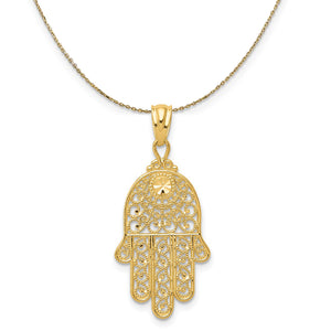 Proudly display your faith and ward off evil while drawing positive energies into your life with this symbolic pendant. Fashioned from 14k yellow gold with a polished and diamond-cut finish, this spiritual charm hangs from a tapered bail and is approximately 13mm (1/2 Inch) in width by 25mm (1 Inch) in length. The pendant is . Includes a 30 Inch, 0.8mm 14k yellow gold cable chain with a lobster clasp.