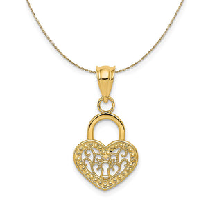 14k Yellow Gold Filigree Heart Key Hole Lock Necklace