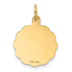 This I love you more charm pendant is crafted with polished 14 karat yellow gold and it features an engravable design with a flat back and scalloped edges. The approximate size is 16 mm x 18 mm and its average item weight is 0.58 grams. This item does not include a chain.
