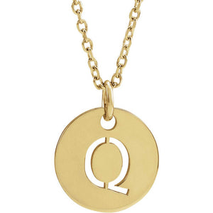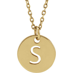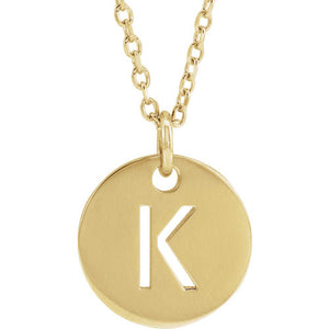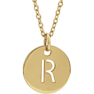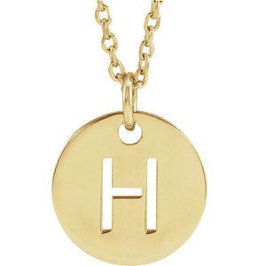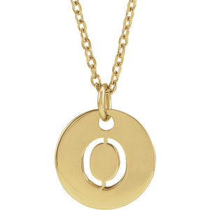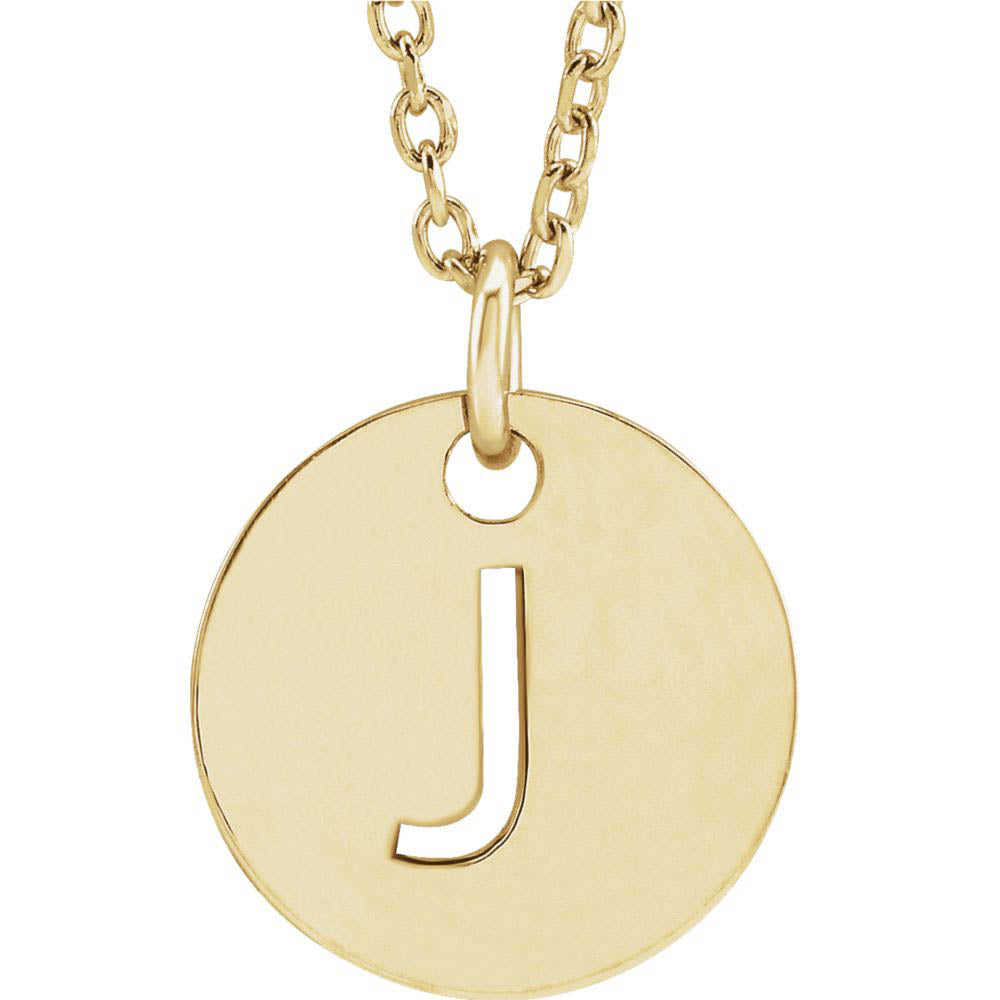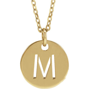 Initial attraction in pierced disc design fashioned from polished 14k yellow gold. Each small charm is approximately 10mm (3/8 inch) in diameter. Includes a 1mm width, solid link 14k yellow gold cable chain that is diamond-cut for added sparkle, closes with a spring ring clasp and is adjustable at 16-inch, 17-inch and 18-inch lengths. Made in the U.S.A.