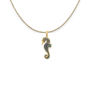 • Marine life treasures, beautiful and bizarre creatures of the vast seas artistically sculpted in 14k gold. This blue enameled seahorse pendant measures approximately 12mm (7/16 Inch) wide by 34mm (1 5/16 Inch) long, which includes the tapered bail. Includes a 20 inch long, 0.9mm wide, solid 14k yellow gold cable chain with a spring ring clasp.