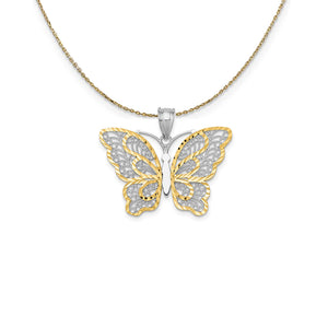 Tie the meaning to the moment with a classic or unusual pendant that makes it personal, thoughtful, or meaningful. This two-tone butterfly pendant crafted in 14k yellow gold with white rhodium plating features a textured and diamond-cut filigree design. The approximate size is 29mm (1 1/8 inch) in width by 23mm (7/8 inch0 in length with the bail. Includes a 18 inch long, 0.9mm wide, solid 14k yellow gold cable chain with a spring ring clasp.