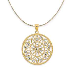 Tie the meaning to the moment with a classic or unusual pendant that makes it personal, thoughtful, or meaningful. This two-tone round pendant crafted in 14k yellow gold and white rhodium features a polished, diamond cut and textured filigree design. The approximate size is 28mm (1 1/8 inch) in width by 36mm (1 3/8 inch) in length with the bail. Includes a 16 inch long, 0.9mm wide, solid 14k yellow gold cable chain with a spring ring clasp.