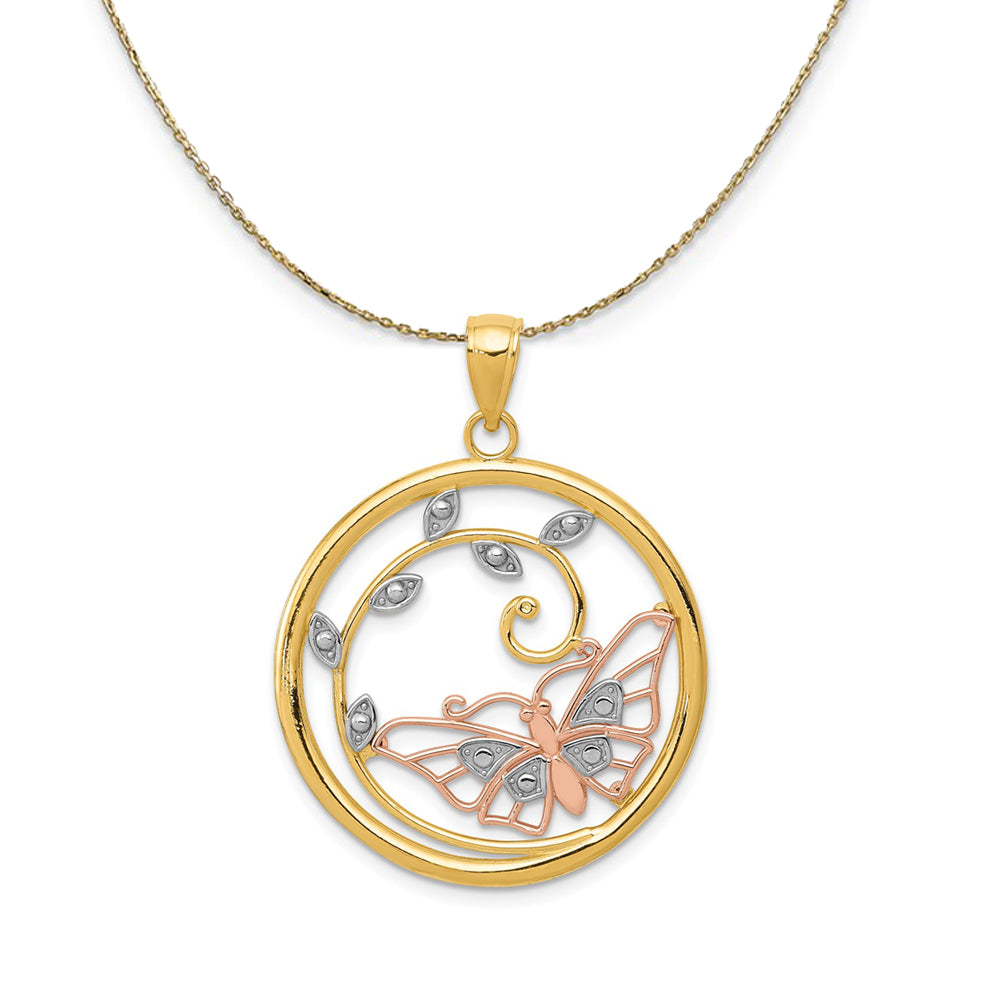 Symbolic of change, elegance, growth, transformation, and more, the butterfly is a treasure trove of good omens. This gleaming pendant fashioned from 14k yellow and rose gold with white rhodium plating is approximately 25mm (1 Inch) in width by 32mm (1 1/4 Inch) in length, which includes the tapered bail. Includes a 16 inch long, 0.9mm wide, solid 14k yellow gold cable chain with a spring ring clasp.