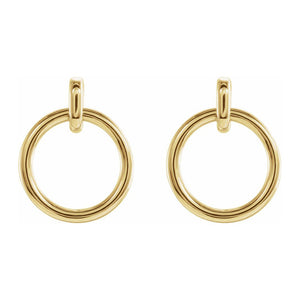 A simple yet timeless design will add a touch of easy elegance to your day. These polished open circle dangle post earrings are fashioned from 14k yellow gold. The approximate diameter is 14mm (9/16 inch) by 18mm (11/16 inch) in length. Friction backs included.