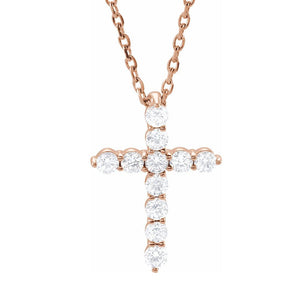 Celebrate and honor all special occasions with jewelry of religious significance! Our collection of spiritually inspired designs that show faith, hope and devotion are perfect for commemorating life's milestones. This small cross necklace created in 14k rose gold is prong set with 11 natural diamonds that are 1.8mm in size, I1 in clarity and G-H in color. The total diamond weight is 1/4 carat. The approximate pendant size is 10mm (3/8 inch) in width by 14mm (9/16 inch) in length. The solid cable chain closes with a spring ring clasp, is 1mm in width and adjustable in length from 16 to 18 inches. This is a made to order item and is estimated to ship in about 6-8 days. Please email service@theblackbow.com for more details.