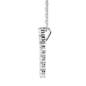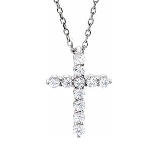 • Celebrate and honor all special occasions with jewelry of religious significance! Our collection of spiritually inspired designs that show faith, hope and devotion are perfect for commemorating life's milestones. This small cross necklace created in rhodium-plated 14k white gold is prong set with 11 natural diamonds that are 1.8mm in size, I1 in clarity and G-H in color. The total diamond weight is 1/4 carat. The approximate pendant size is 10mm (3/8 inch) in width by 14mm (9/16 inch) in length. The solid cable chain closes with a spring ring clasp, is 1mm in width and adjustable in length from 16 to 18 inches.