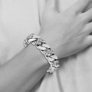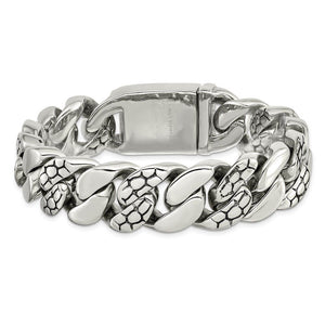 Rugged masculine style created from polished stainless steel featuring a snake skin textured accent design. It is approximately 19mm (3/4 inch) in width by 8.5 inches in length, which includes the box clasp.