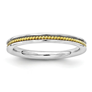 Make it simple and stylish with stackable bands of different textures, finishes, widths and colors! This rhodium plated sterling silver band features a yellow gold tone channeled center with a polished finish that measures 2.5mm wide. Guaranteed to fit together perfectly with all of the mix and match Stackable Expressions rings. This item is backordered. Please allow 7-10 business days for delivery