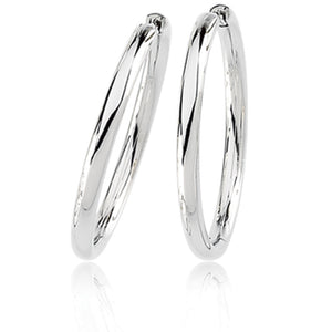 These classic round hoop earrings fashioned from polished 14k white gold are available in a variety of sizes to suit your fashion needs. They feature an endless, solid tube, hinged design and this pair is approximately 2.6mm thick by 39mm (1 1/2 inch) in diameter.