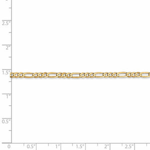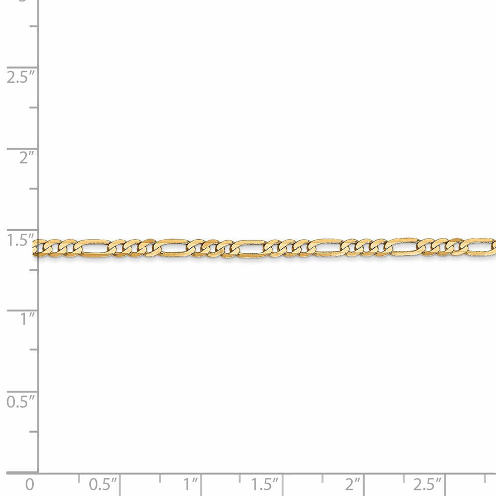 Round and oval links made of polished 14k yellow gold interlock in a reoccurring three and one pattern that closes with a lobster claw clasp. The easy elegance of a flat Figaro chain looks great with dress or casual wear and the 2.75mm width is perfect on its own or paired with other chains for a layered look.