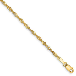 This 2mm width, solid link Singapore chain is crafted from polished, 14k yellow gold and closes with a lobster clasp. 7 inches in length.