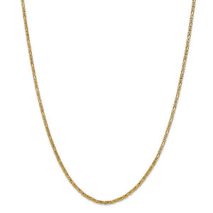 Interwoven byzantine links of polished yellow gold form a distinctive design that will add elegance and beauty to your ensemble. This 2mm wide, solid link chain closes securely with a heavy duty lobster clasp. 24 inches in length.
