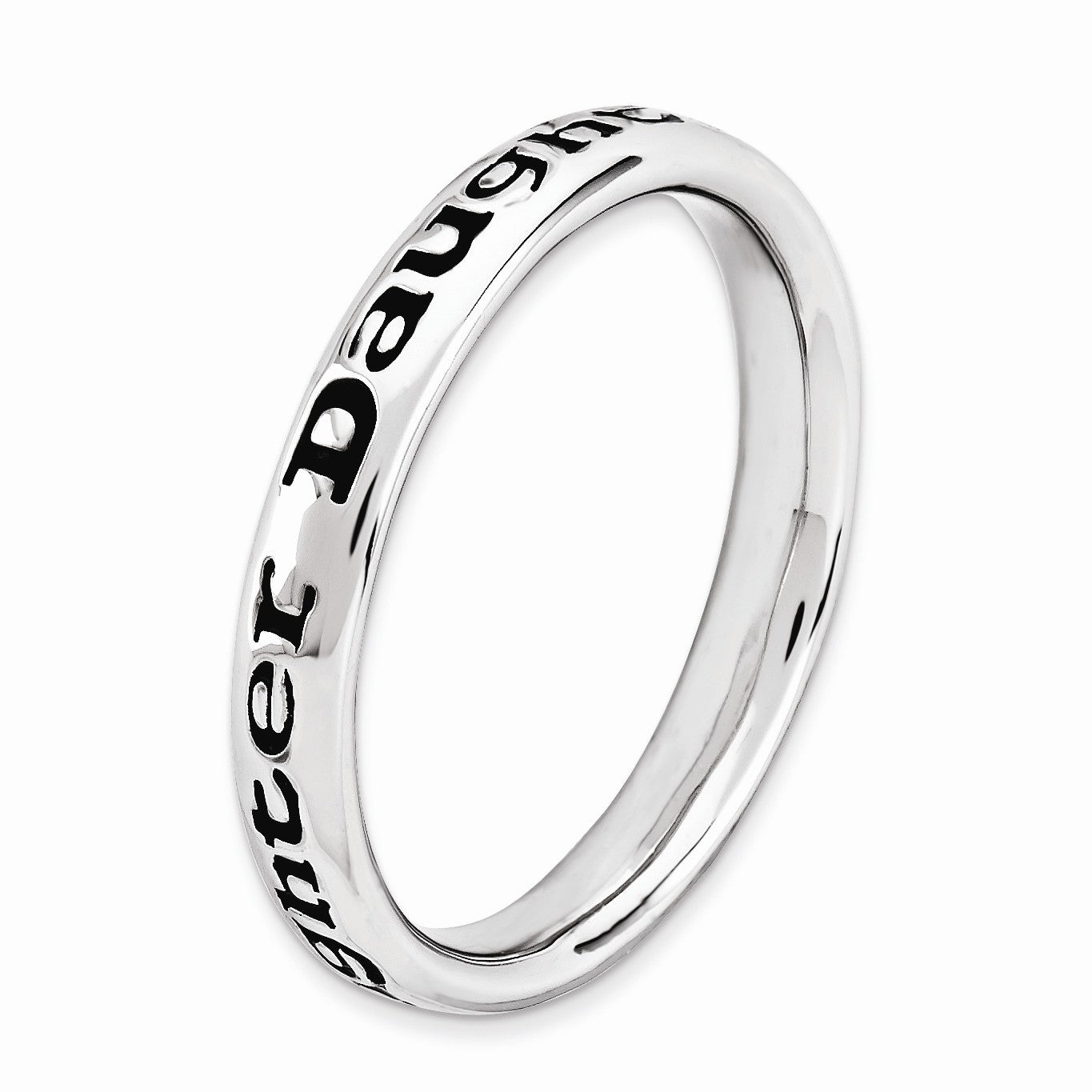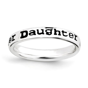 Add a personalized touch to your stack and cultivate a style uniquely yours with this Daughter script designed, 3. Mm width band. It is fashioned from tarnish resistant rhodium plated sterling and black enamel. Wear it alone or stacked in a meaningful collection, guaranteed to fit together perfectly with all of the mix and match Stackable Expressions rings.