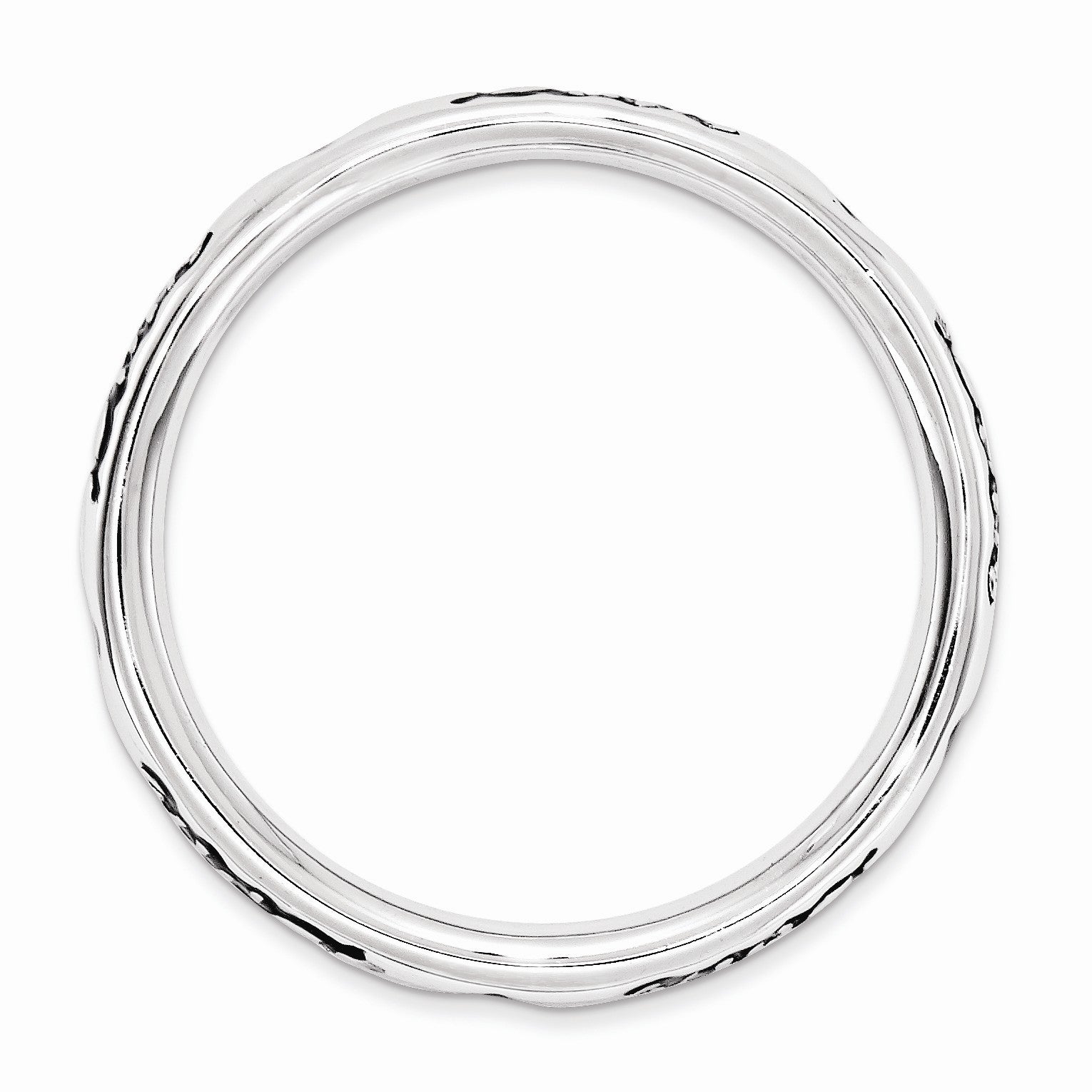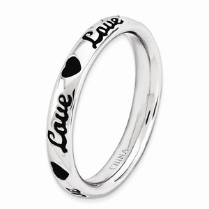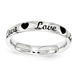 • Add a personalized touch to your stack and cultivate a style uniquely yours with this Love script and heart designed, 3. Mm width band. It is fashioned from tarnish resistant rhodium plated sterling and black enamel. Wear it alone or stacked in a meaningful collection, guaranteed to fit together perfectly with all of the mix and match Stackable Expressions rings.