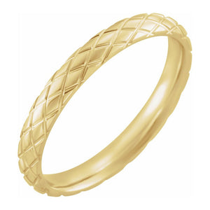 Simply striking, a distinctive style made from 14k yellow gold featuring a half round shape with a crisscross patterned design and polished finish. This unique comfort fit band is 3mm in width. This is a made to order item and is estimated to ship in about 10 days. Please email service@theblackbow.com for more details.