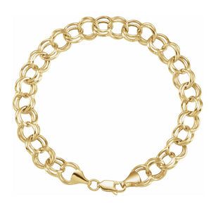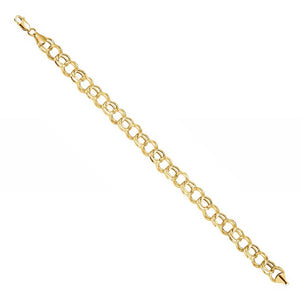 • This classic paralleo cable chain bracelet features hollow, open, double links ideal for hanging charms. It is fashioned from 14k yellow gold, is 5.7mm in width by 8-inches in length and closes with a lobster claw clasp.