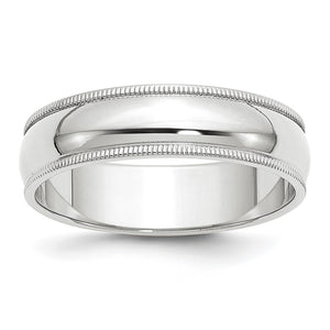 A tried and true favorite style featuring a half round center with milgrain edges created from rhodium-plated 14k white gold. This polished unisex band has a standard fit shank, is approximately 1.45mm in thickness and 6mm in width. Suitable for engraving.�