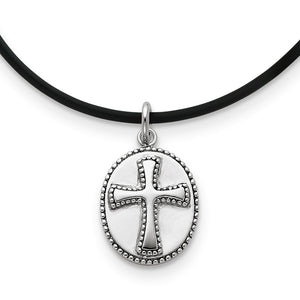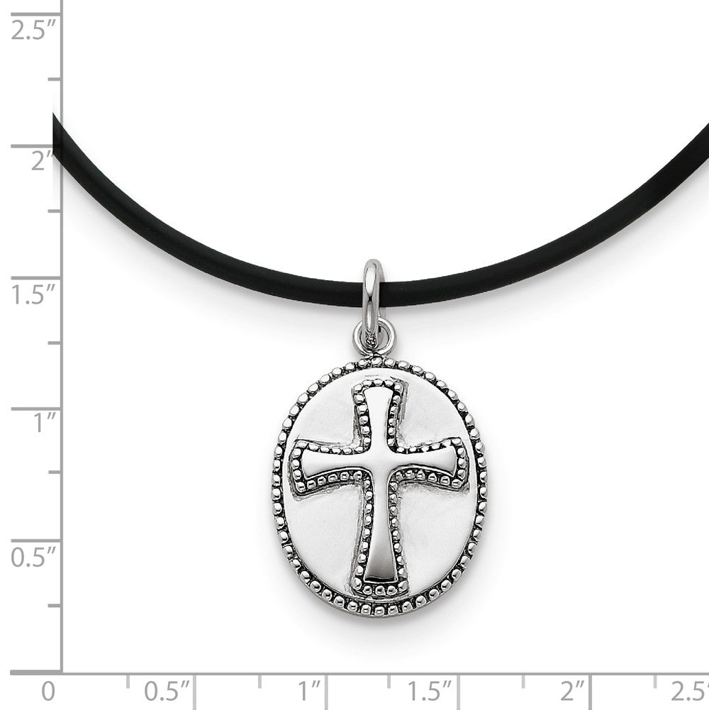 Express your bold attitude with this impressive 1 inch cross pendant featuring milgrain edges. Designed from rhodium plated sterling silver with an antiqued finish, it comes ready to wear with a 2mm by 18 inch black rubber cord chain. It also includes a card with the following verses printed in English and Spanish. VERSE: For God did not give us a spirit of timidity but a spirit of power of love and self discipline 2nd....Timothy 1:7. VERSE: The mind controlled by the spirits is life and peace....Romans 8:6