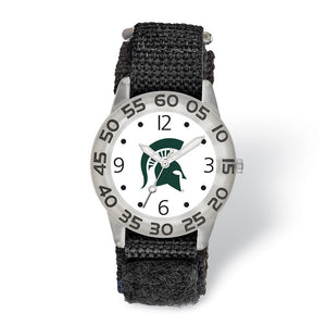 Category: 2 Year Warranty 3 ATM (Tested) Water Resistant Alloy Analog Display Black Colored Band Boys Watches Collegiate Girls Watches Hook and Loop Closure Kids Watches Mineral Crystal NCAA NCAA - Michigan State U. Not Engravable Nylon Band Quartz (Battery Operated) Round Face Stationary Bezel White Face Wrist Watch